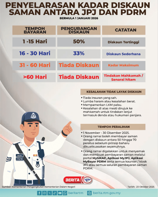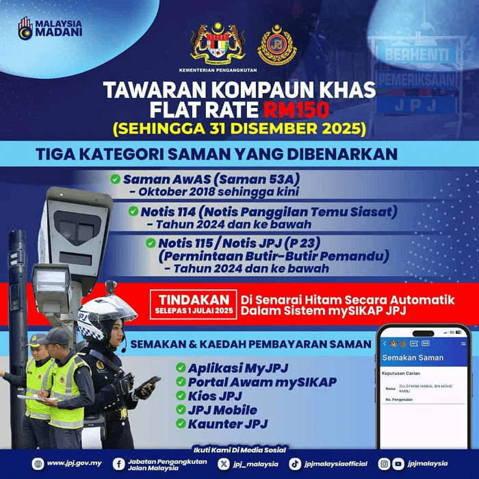 January 2025 : The JPJ has announced a Special Flat Rate Compound Offer – RM150 for selected JPJ summons notices until 31 December 2025.
