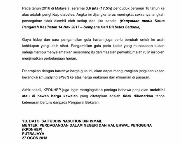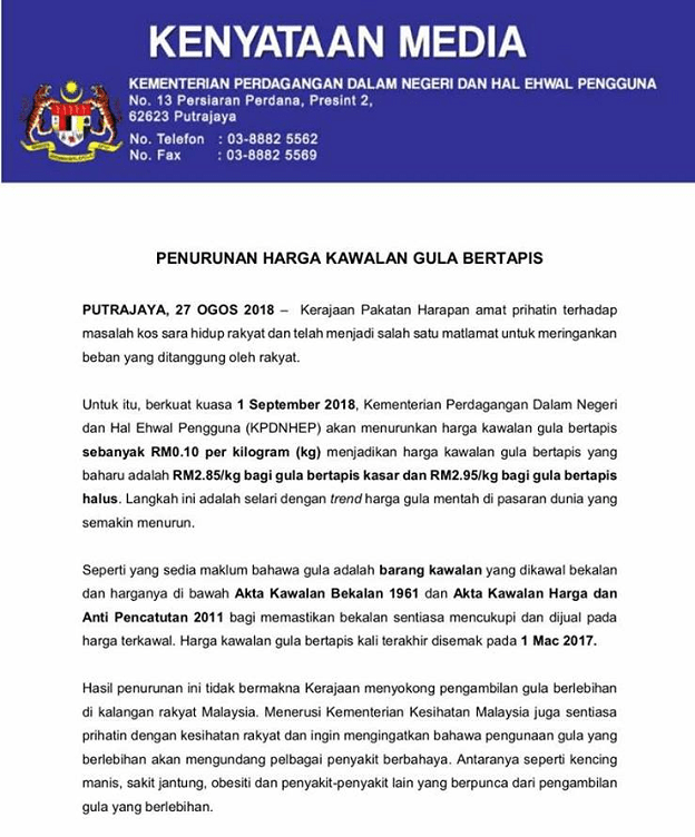 Antara lain kenyataan media KPDNKK memaklumkan bahawa penurunan harga gula adalah usaha Kerajaan Pakatan Harapan yang amat prihatin terhadap masalah kos sara hidup rakyat yang antara lain penurunan harga dapat meringankan beban yang ditanggung oleh rakyat dalam keadaan ekonomi negara yang tidak menentu.