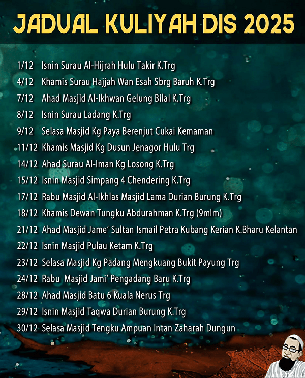 Semoga perkongsian Jadual Kuliah UAI bulan Disember 2025 ini bermanfaat buat semua. Jangan lepaskan peluang keemasan untuk mengikuti ceramah UAI ini kepada mereka yang tinggal berdekatan dengan tempat lokasi ceramah seperti dikongsikan dalam jadual di atas ini. Jom ramai-ramai ke Kuliah UAI.