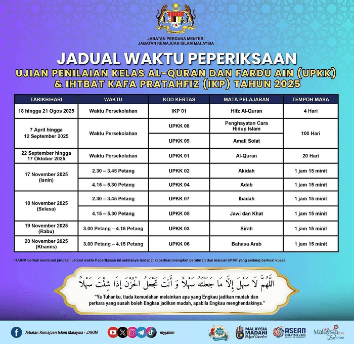 Jadual Waktu Peperiksaan Ujian Penilaian Kelas Al-Quran Dan Fardu Ain (UPKK) & Ihtbat Kafa Pratahfiz (IKP) Tahun 2025