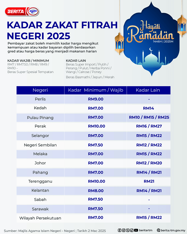 Berikut dikongsikan Jadual Kadar Bayaran Zakat Fitrah 2026 – 2025 Seluruh Negeri Di Malaysia :-