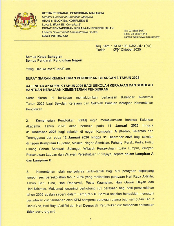 Kementerian Pendidikan (KPM) ingin memaklumkan bahawa Kalendar Akademik Tahun 2026 bagi Sekolah Kebangsaan dan Sekolah Bantuan Kerajaan akan bermula pada 11 Januari 2026 hingga 31 Disember 2026 bagi negeri Kumpulan A dan 12 Januari 2026 hingga 31 Disember 2026 bagi negeri Kumpulan B.