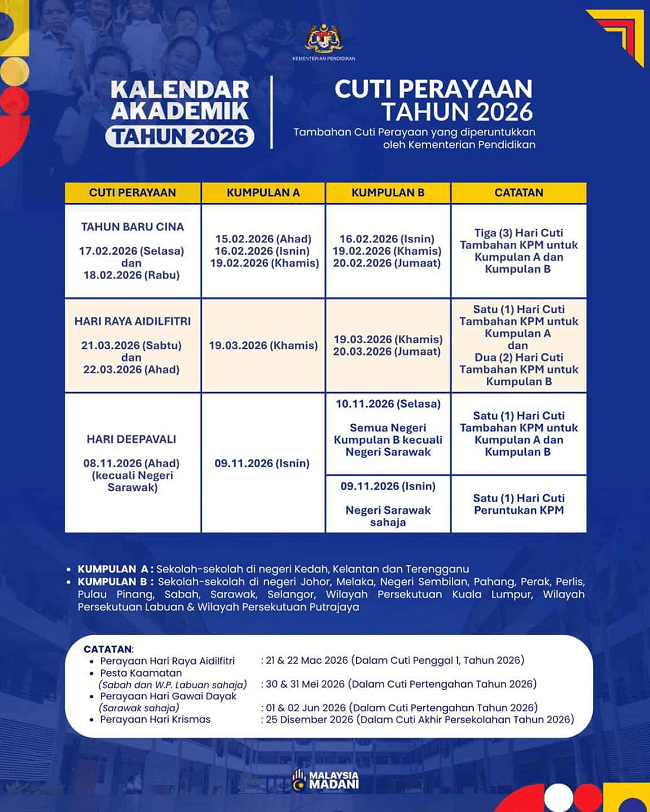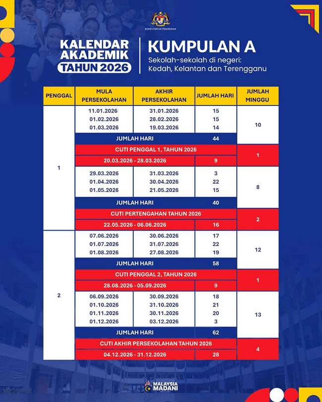 Kalendar Jadual Cuti Umum 2026 Dan School Holidays Malaysia. Berikut dikongsikan Kalendar 2026 Malaysia yang memaparkan tarikh penting meliputi tarikh “Public Holidays” dan “Malaysia School Holidays” untuk tahun 2026. Kalendar Cuti Umum dari JPM (Bahagian Kabinet) ini tertakluk kepada perubahan yang akan dikemaskini dari masa kesemasa. “Malaysia School Holidays” yang diumumkan oleh KPM juga dikongsikan dibawah ini.