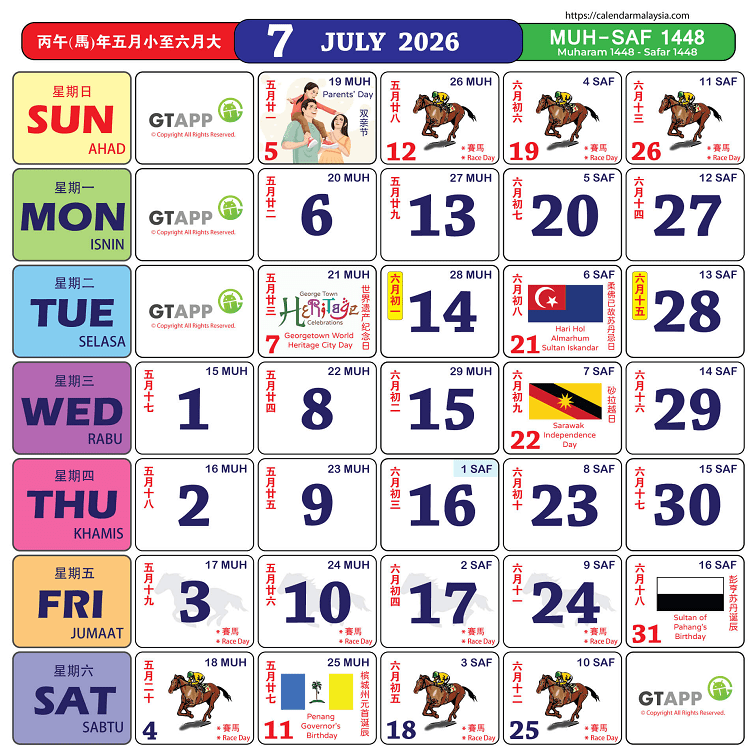 - 7 Jul (Selasa) : Hari Ulang Tahun Perisytiharan Tapak Warisan Dunia – Pulau Pinang