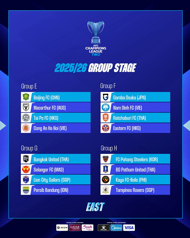 - Kumpulan E: Beijing FC (China), Macarthur FC (Australia), Tai Po FC (Hong Kong), Cong An Ha Noi (Vietnam).