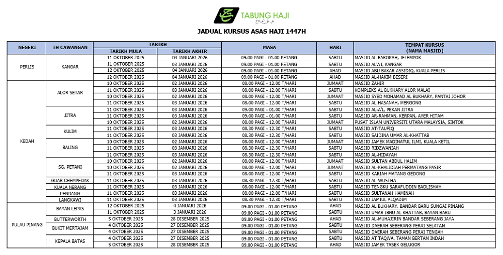 Jadual Dan Lokasi Kursus Asas Haji (KAH) 2026 / 1447H Seluruh Negeri. Kepada jemaah haji yang terpilih pada tahun semasa dan juga kepada orang ramai yang berminat untuk mempelajari hal ehwal ibadat haji dan umrah, Jadual Kursus Asas Haji 2026 Seluruh Negeri akan dikeluarkan oleh Tabung Haji Malaysia. Peserta yang berminat untuk mengikuti Kursus Asas Haji (KAH) 1447H perlu mendaftar di masjid-masjid yang terlibat dalam menganjurkan kursus ini. Senarai di bawah ini menyertakan nama masjid yang terlibat setiap negeri dan tarikh mula dan akhir KAH diadakan.