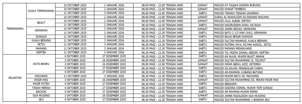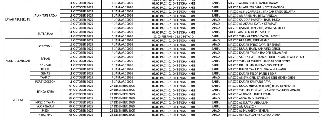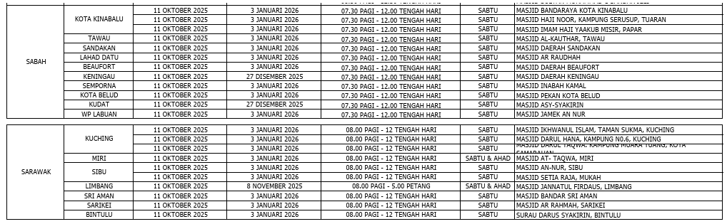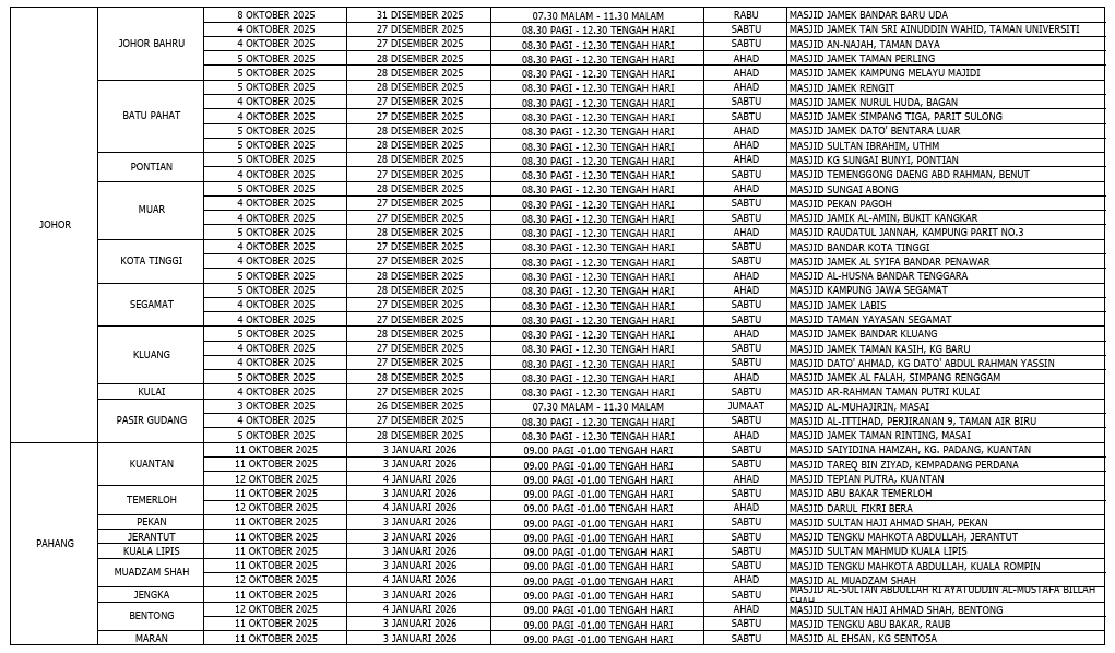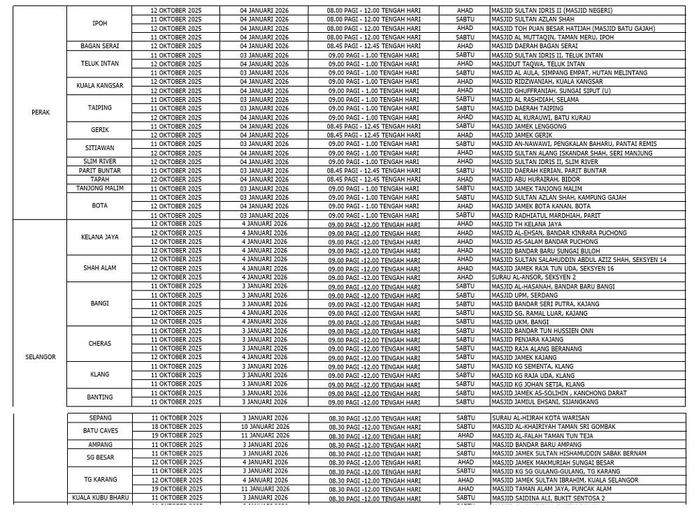 Berikut adalah jadual KAH 1447H mengikut negeri mengandungi maklumat tempat kursus iaitu nama masjid, tarikh mula & akhir, masa dan hari.