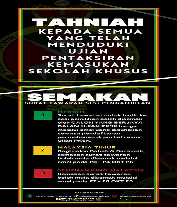 Bagi Calon Sabah & Sarawak, semakan surat tawaran boleh mula disemak melalui emel pada 23 – 24 Oktober 2025