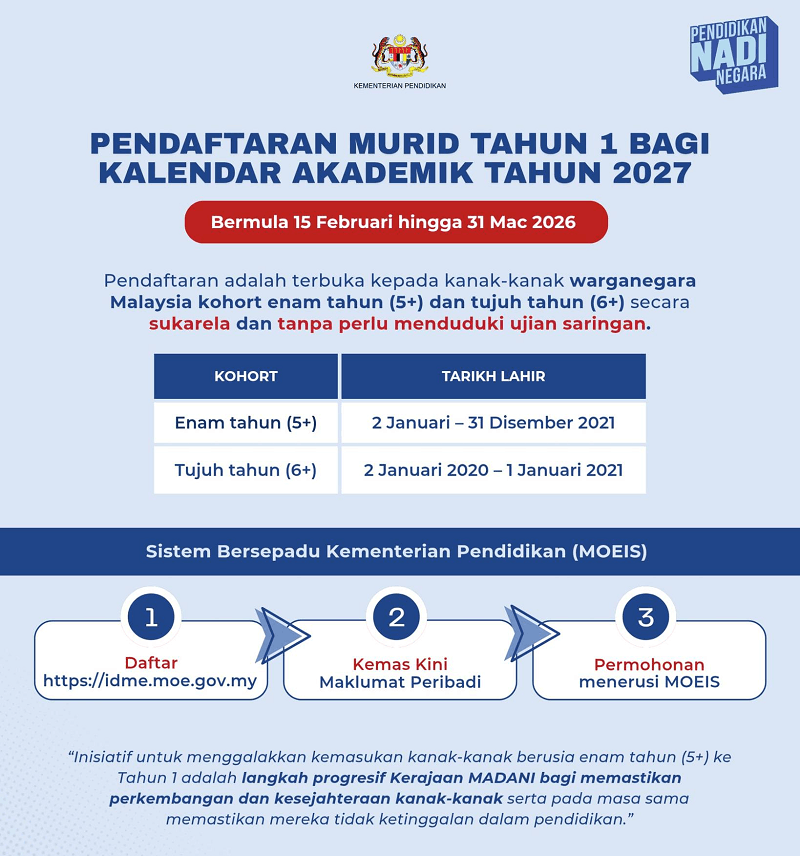Untuk makluman, pendaftaran murid Tahun 1 bagi Kalendar Akademik 2027 akan dilaksanakan secara dalam talian bermula 15 Februari hingga 31 Mac 2026 melalui MOEIS di
