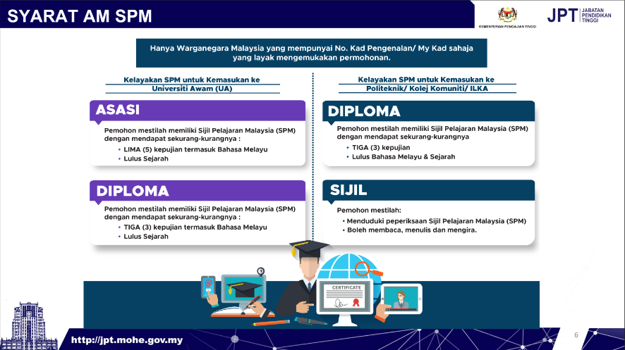 Untuk Maklumat Terkini, Lengkap Dan Tepat, sila layari Facebook page rasmi Bahagian Pengurusan Kemasukan Pelajar, Jabatan Pengajian Tinggi (BPKP JPT) atau laman web Bahagian Pengurusan Kemasukan Pelajar (UPU) di pautan https://upu.mohe.gov.my.