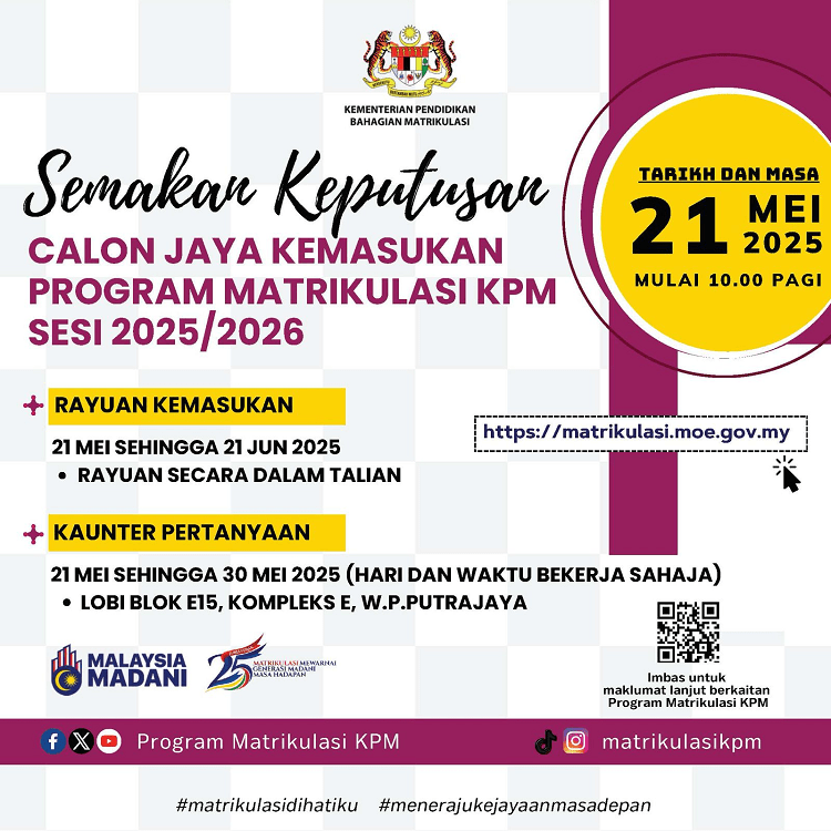 Apapun, yang pasti keputusan tawaran Program Matrikulasi sesi 2025 / 2026 akan diumumkan keluar selepas result SPM diumumkan.