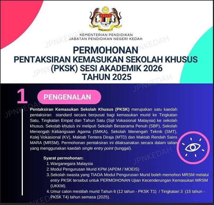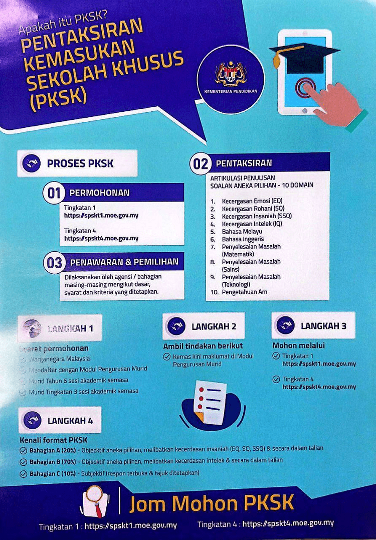 Semakan Pusat PKSK Tingkatan 1 & 4 Secara Online.PKSK adalah singkatan kepada Pentaksiran Kemasukan Sekolah Khusus. Ia merupakan satu kaedah pentaksiran standard yang digunakan untuk kemasukan murid ke sekolah-sekolah khusus seperti Sekolah Berasrama Penuh (SBP), Sekolah Menengah Kebangsaan Agama (SMKA), Sekolah Menengah Teknik (SMT), Kolej Vokasional (KV), MR SM dan Maktab Tentera Diraja (MTD). PKSK menilai pelbagai aspek termasuk akademik, kemahiran berfikir, pengetahuan am, dan kemahiran bahasa.